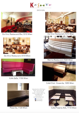 Polsterungs- und Tapezierarbeiten, Gastronomie und HotelbetriebenMit unserer mehr als 20-jähriger Textilhandel-Erfahrung haben wir ein neues Möbellabel „KESHTE DESIGN“ gegründet und seit Juni 2012 sind wir mit unseren Kollektionen erfolgreich auf dem Markt. Wir führen diverse Möbelkolektionen und bieten unseren Kunden auch Polsterungarbeiten an. Neben zahlreichen Privatkunden werden unsere Dienste auch von Gastronomie und Hotelbetrieben in Anspruch genommen.Unser Team kann Ihnen auch Innenausstattung-Gesamtlösungen für Ihren Betrieb anbieten (Eckbänke, Tische nach Maß, Lounge-Möbel, Diwans, etc.)